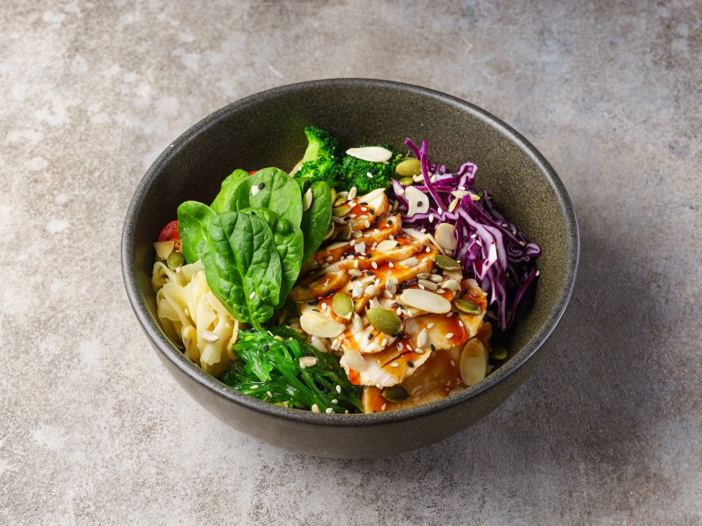 куриная грудка су-вид, рис, брокколи, томаты черри, красная капуста, микс салата, чука, маринованный имбирь, соус понзу, терияки соус, микс орехов.