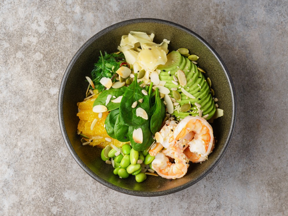 рис, креветки, авокадо, сегменты апельсина, чука, бобы эдамаме, микс салата, маринованный имбирь, ореховый соус, соус понзу, микс орехов.