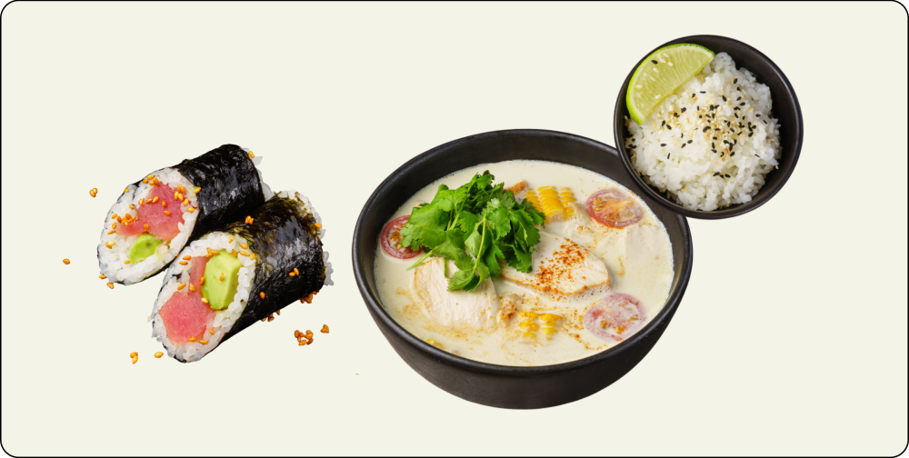 Ароматный Том Кха с дарами океана и свежий хэнд-ролл с нежным тунцом. Взрывной тайский характер и японская утонченность в одном наборе! Состав: Том кха с морепродуктами, кулек хэнд-ролл с тунцом
