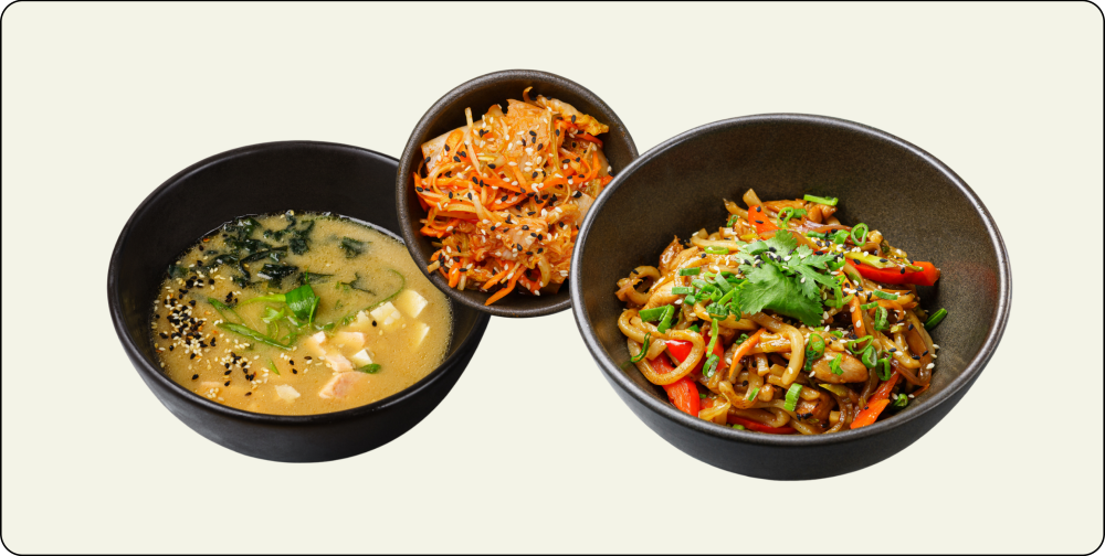 Трио азиатской кухни: глубина, острота и сытность! Согревающий мисо-суп с лососем, огненная кимчи для тонуса и сытный вок удон с говядиной. Полное погружение в многослойность вкусов Азии. Состав: мисо-суп с лососем, вок удон с говядиной, кимчи капуста.