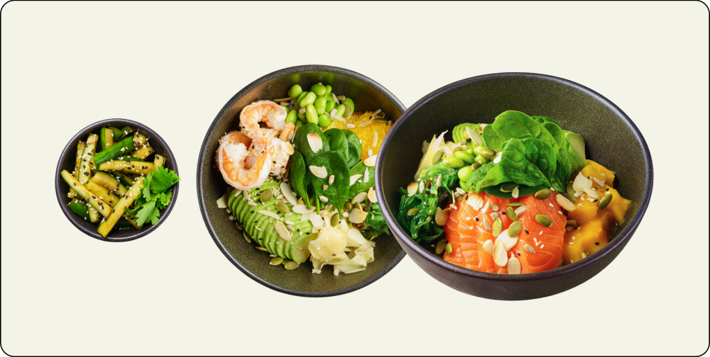 Сет для двоих: два поке и хруст. Лосось и креветка в роли главных героев, и огурцы в качестве свежего акцента. Просто, сочно и очень вкусно. Состав: поке с лососем стандарт, поке с креветкой стандарт, битые огурцы.