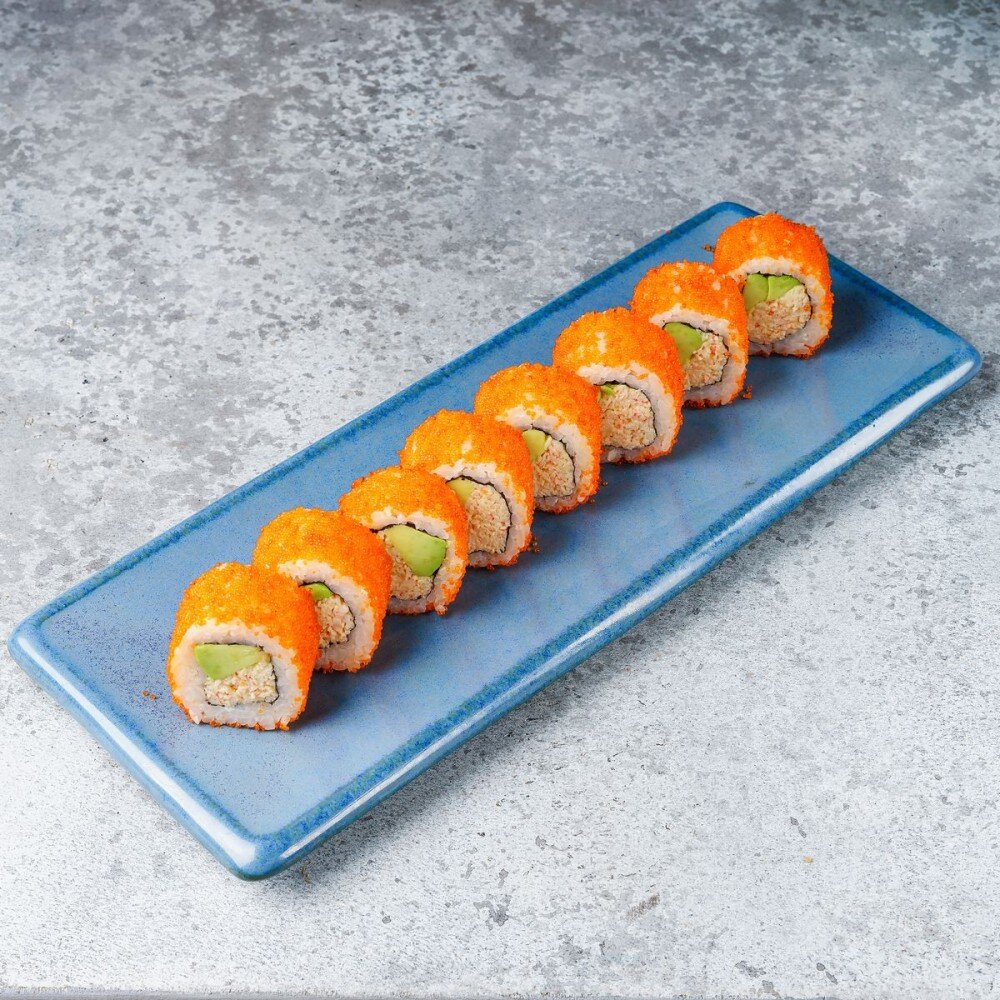 Тот самый ролл. Рис снаружи, щедро обсыпанный масаго. Внутри — нежная смесь на основе настоящего краба и ломтик авокадо. Никаких экспериментов, только уважение к оригиналу и качественные ингредиенты. Классика есть классика.