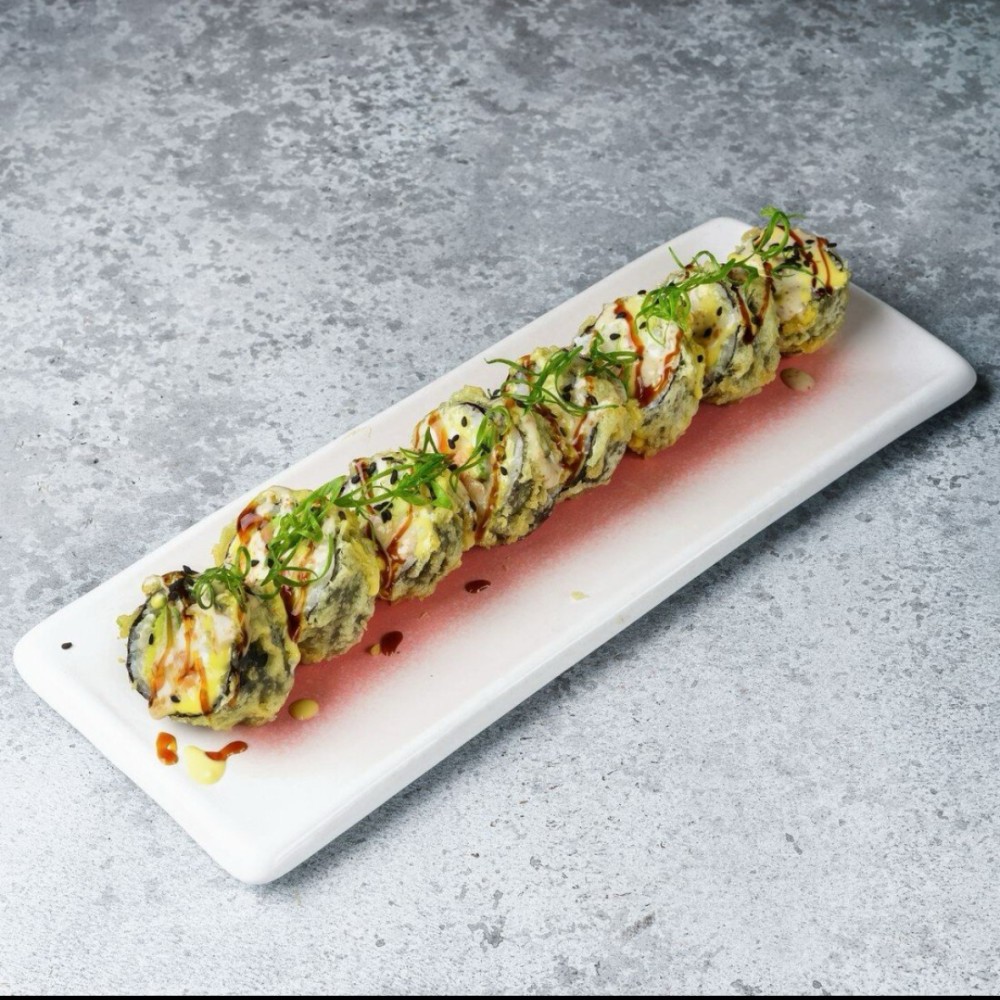 рис, лосось, сливочный сыр, авокадо, темпура, соус манго-майо, кляр, ореховый соус, нори, унаги соус, кунжут микс.