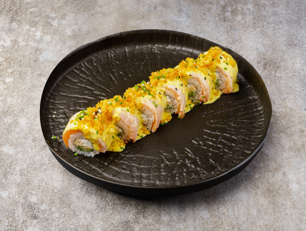 рис, мясо камчатского краба, атлантический лосось, огурец, сливочный сыр, соус унаги, соус манго-майо, стружка тунца, лук шнит, кунжут микс.