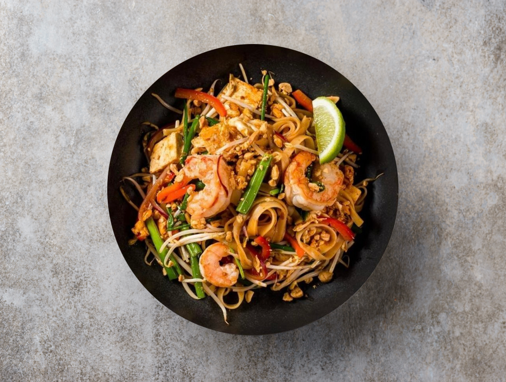 рисовая лапша, креветки, болгарский перец, тофу, ростки сои, арахис, соус Пад Тай, соевый соус, омлет, кинза, лайм, специи.