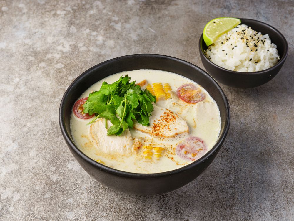 классический бульон Том Кха на основе куриного бульона со сливками и кокосовым молоком, грудка куры су-вид, томаты черри, вешенки, кукуруза, кунжут и, конечно, рис с лаймом.