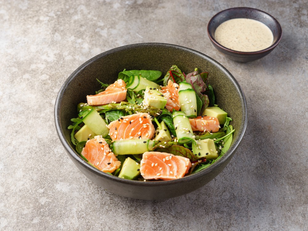 лосось, огурец, томаты, микс салатов, соус ореховый шисо, соус понзу, кунжут.