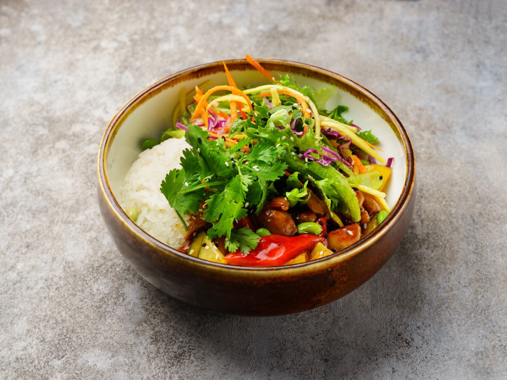 цыпленок терияки, болгарский перец, цукини, рис, бобы эдамамэ, соевый соус, соус понзу, кунжут микс.