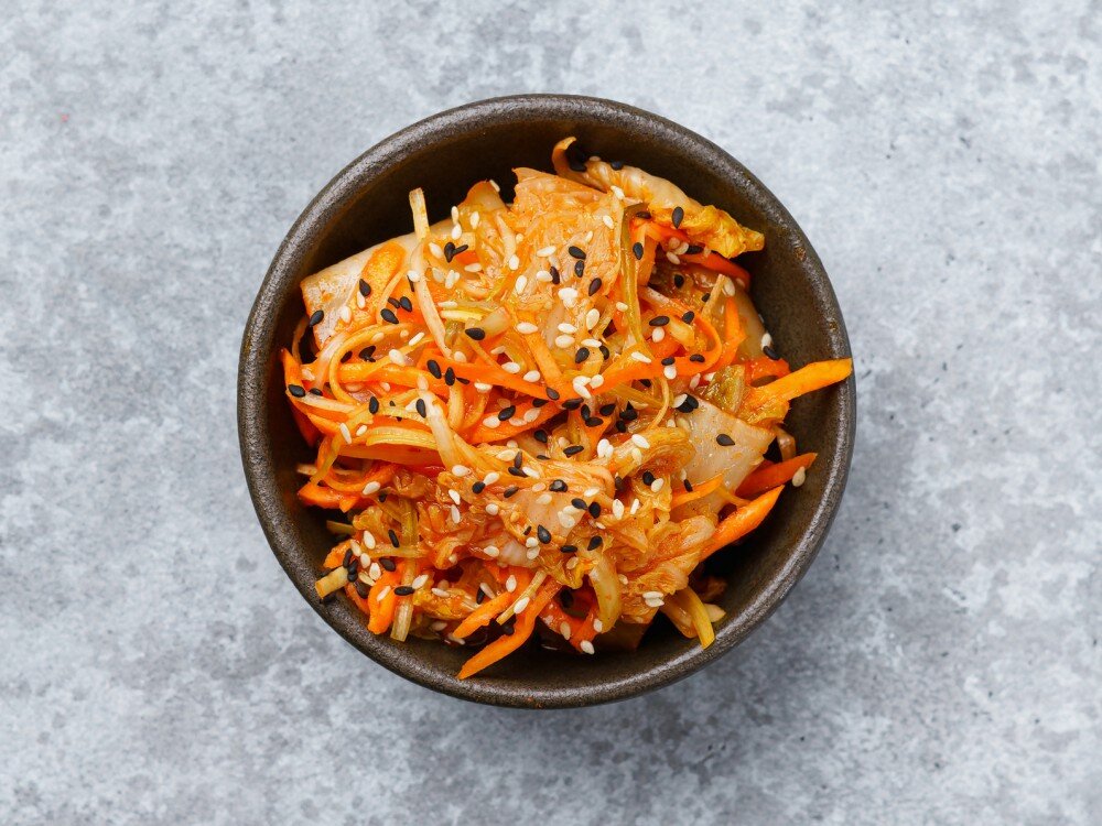 Кимчи — знаменитая ферментированная острая закуска, символ корейской кухни. Хрустящая пекинская капуста и морковь, залитые фирменным острым соусом кимчи.