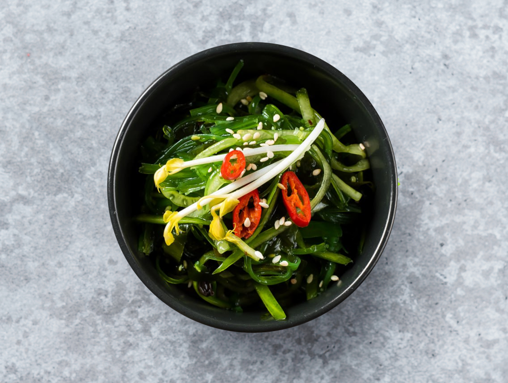 Классическая закуска из Японии — салат Чука из маринованных водорослей вакаме. К ним добавляются хрустящие ростки сои. Соус на основе кунжута, арахиса и сои связывает вкусы.