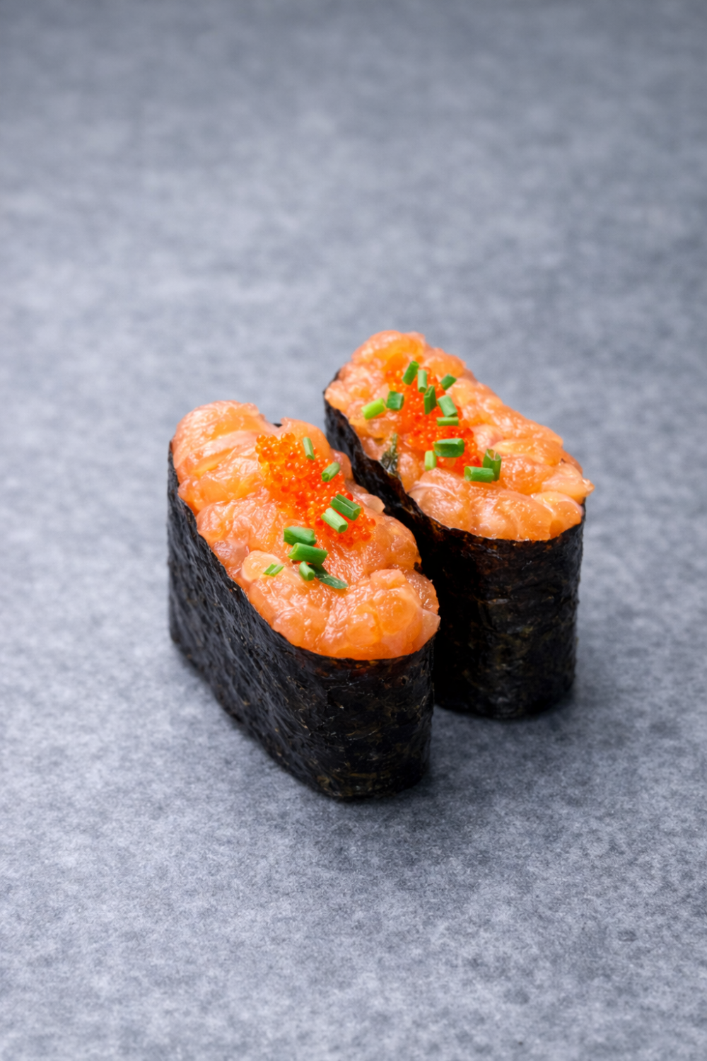Нежное филе лосося на рисе в «лодочке» из нори, с икрой масаго и зеленым луком. Сытный и узнаваемый вкус в удобном формате. Порция: 2 гункана.