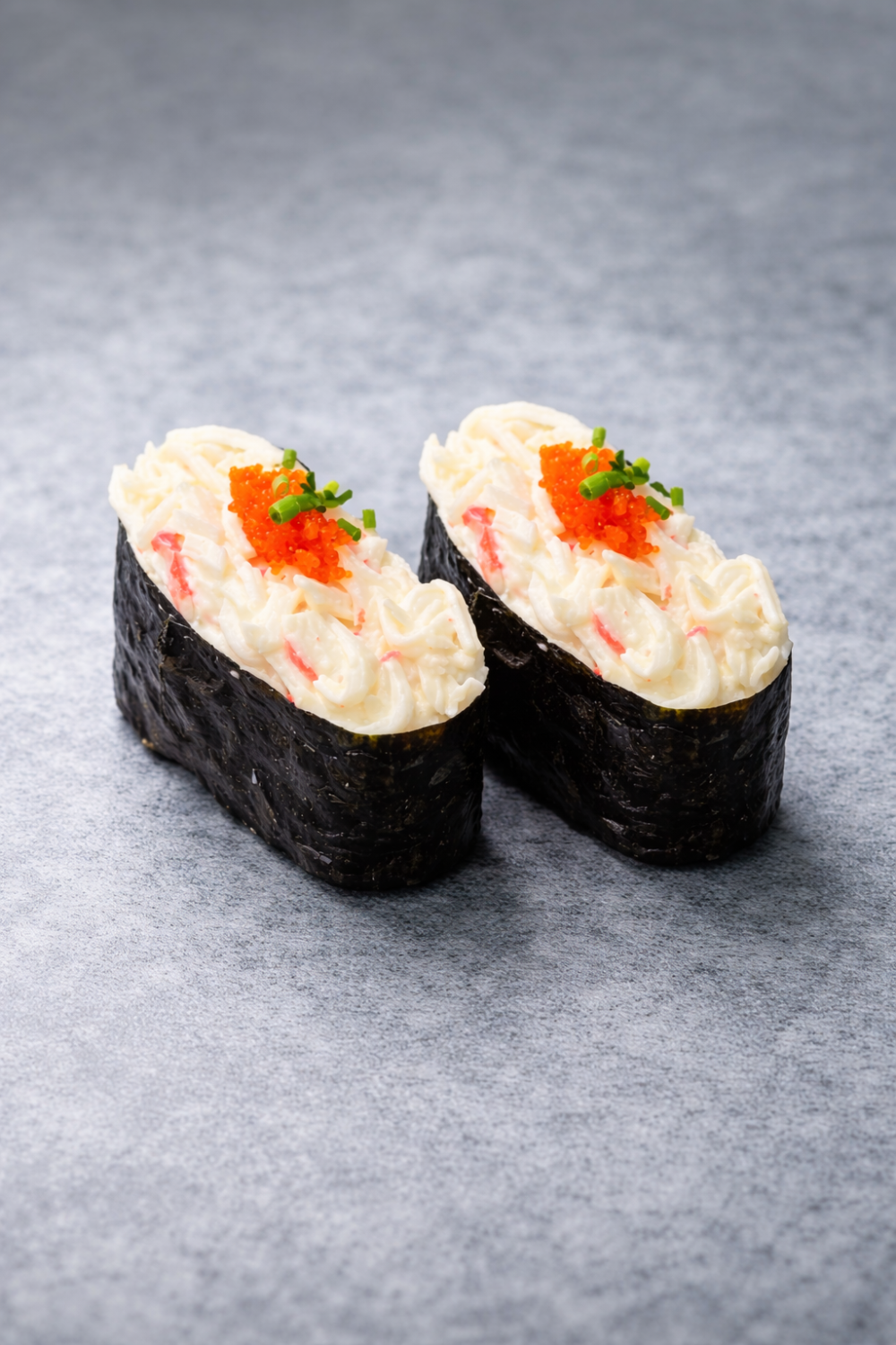 Мясо камчатского краба с японским майонезом на рисе в нори. С икрой масаго и зеленым луком. Нежный, сливочный вкус с морскими нотками. Порция: 2 гункана.
